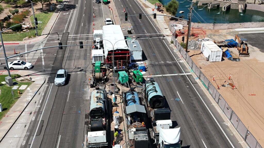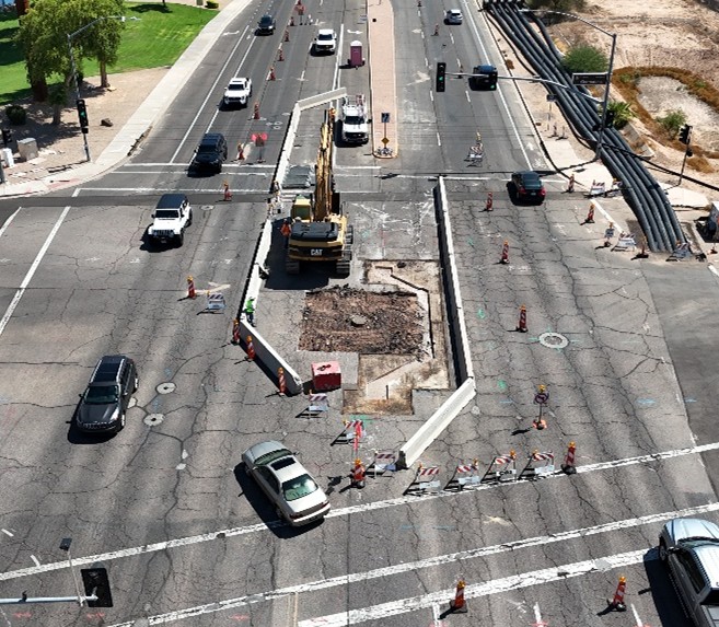 - Significant Traffic Control Needs: The 66-inch sewer is located along Price Road, a busy six-lane arterial that intersects the SR 202 and SR 101, surrounded by industry and ongoing development. Traffic lane restrictions required night and weekend work.