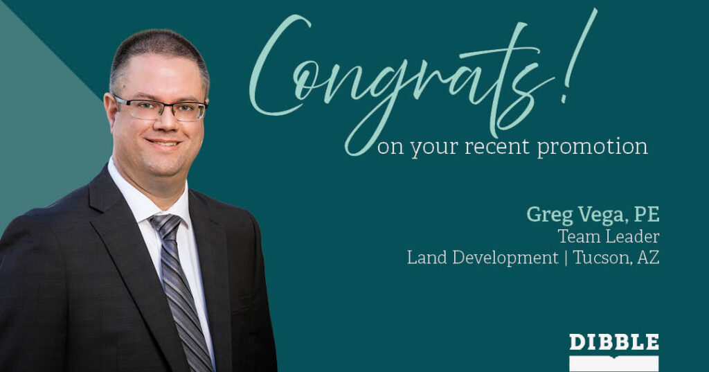 Dibble is proud to announce the promotion of Greg Vega, PE to Senior Project Manager/Team Leader for the Land Development team in our Tucson office. This advancement reflects Greg’s exceptional technical expertise, leadership, and long-standing commitment to delivering high‑quality civil engineering solutions across southern Arizona and the state.