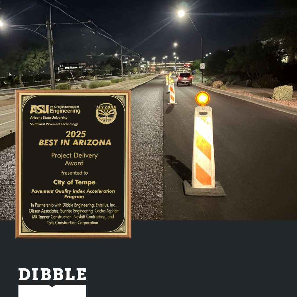 Dibble is honored to be recognized for our role in the Pavement Quality Index Acceleration Program with the City of Tempe, which has been awarded the 2025 Best in Arizona Project Delivery Award.